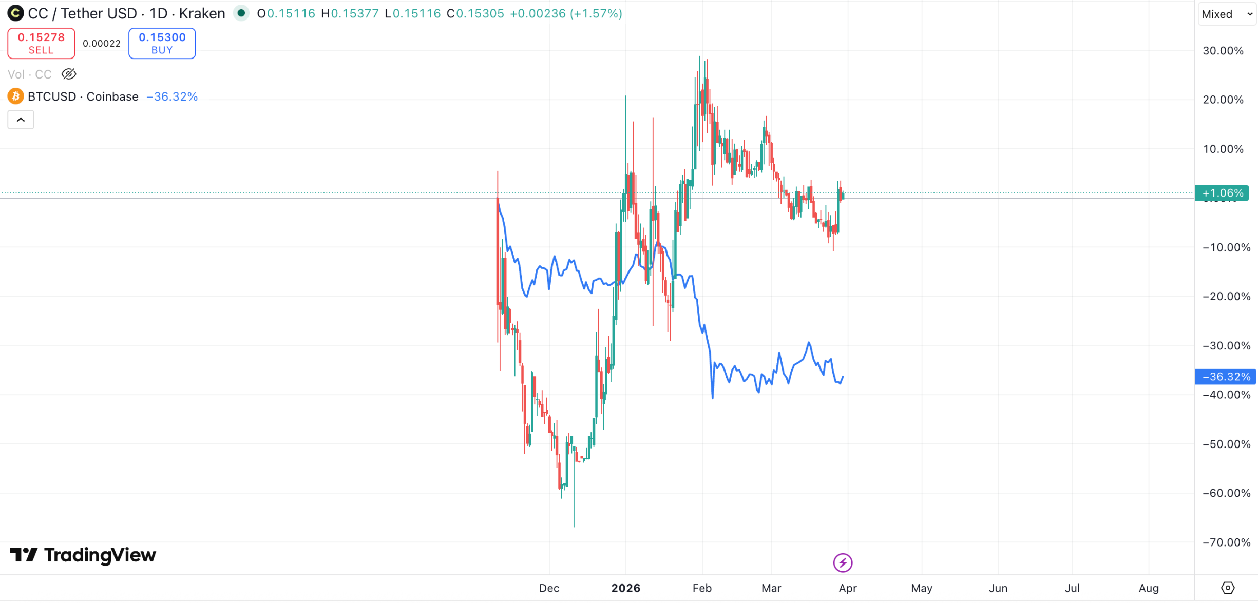Canton 代币 CC 在去年 12 月上旬跌至 0.05 美元附近后持续上涨,最高涨至接近 0.2 美元,当前回落至 0.15 美元附近。