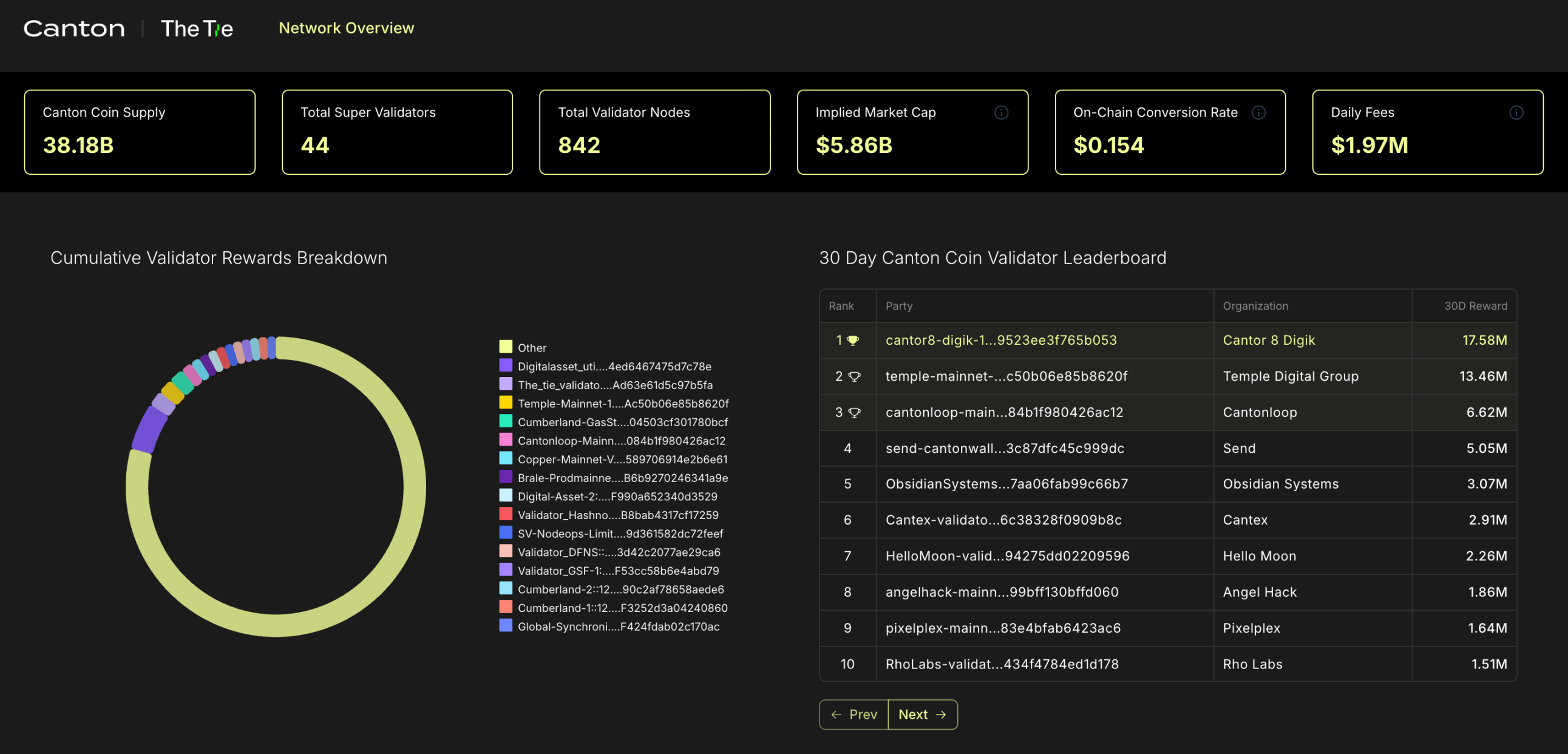 CC 拥有比较特别的销毁机制,Canton Network 上的交易费用以美元计价但以 CC 支付,用以支付交易费用的 CC 会被全数销毁。根据 The Tie 统计的数据,Canton 的单日交易费用接近 200 万美元。