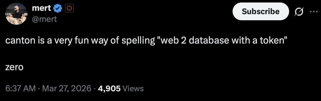 Solana 基础设施提供商 Helius CEO 直言 Canton 就是「发行代币的 Web2 数据库」,ZKsync 创始人则是发布长文反驳 Canton 创始人认为零知识证明对机构金融交易而言风险过高的观点,并且反过来认为 Canton 的隐私基于脆弱的信任假设,风险更高。