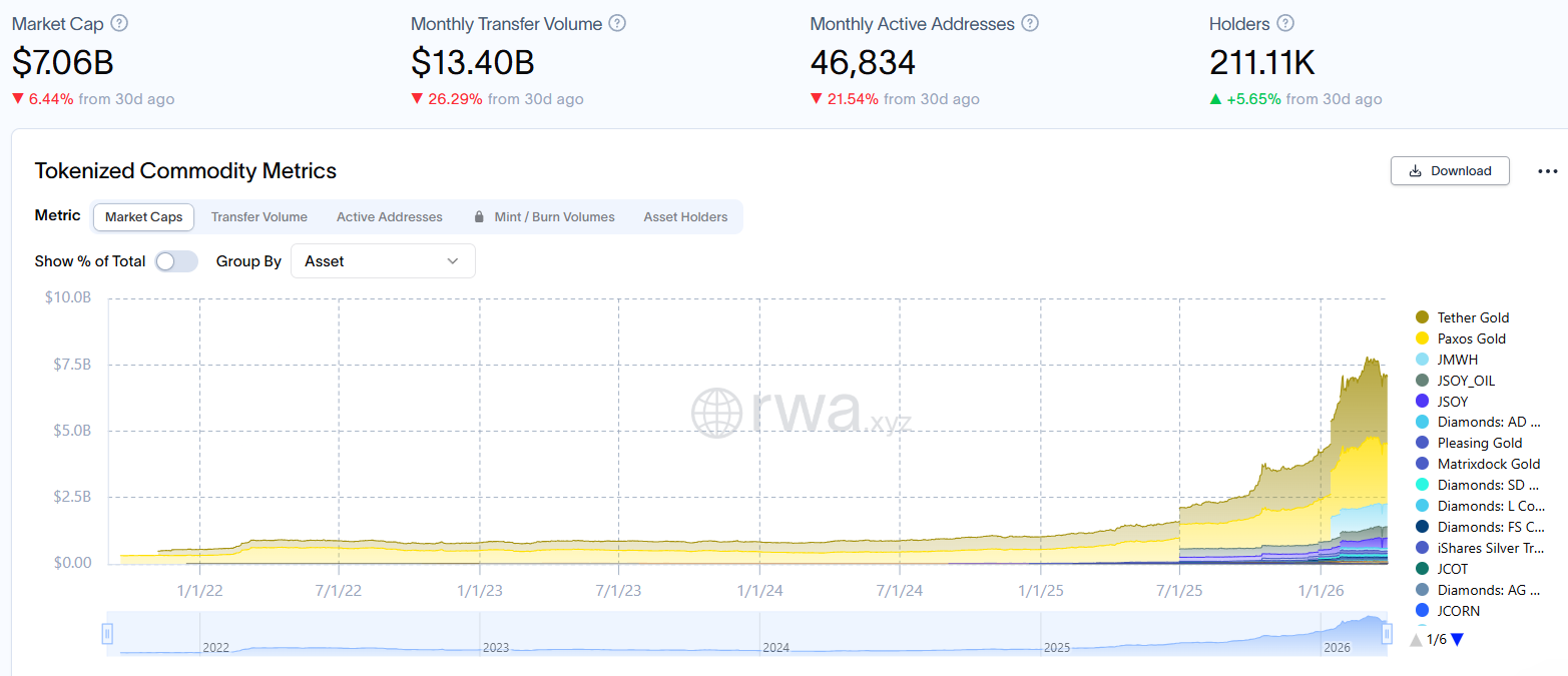 投资者对代币化大宗商品的需求正在上升。根据 RWA.xyz 的数据,代币化大宗商品总市值一度飙升至 77亿美元,3月6日达到峰值,但截至周一已回落至 70亿美元。