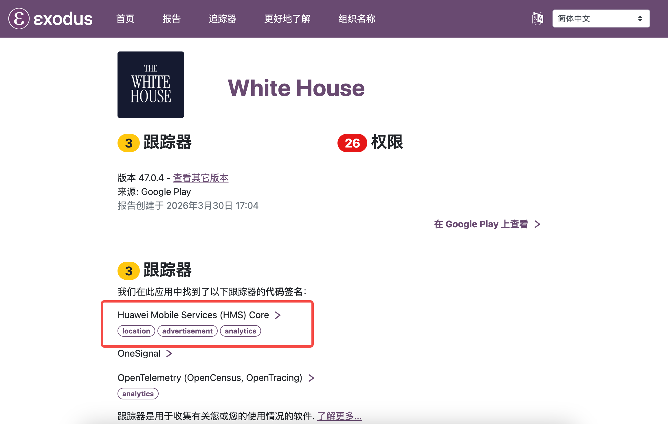 安全研究员 Sam Bent 对白宫 App(版本号 47.0.1)进行逆向分析后,通过 Exodus Privacy 进行了扫描。Exodus Privacy 是一个开源的 Android 应用隐私审计平台,专门检测 App 内嵌的追踪器和权限请求,在隐私研究社区被广泛使用。扫描结果显示,白宫 App 内嵌 3 个追踪器,其中一个是 Huawei Mobile Services Core(华为移动服务核心组件)。