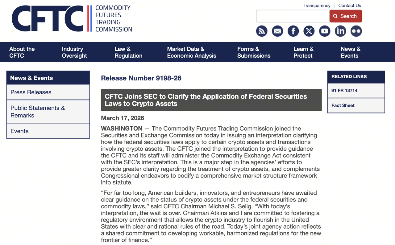 这种权力的重新切分其实是一次深思熟虑的“利益赎买”。对于 SEC 而言,甩掉沉重的原生代币监管包袱,可以集中力量应对传统资产代币化带来的复杂合规挑战;对于 CFTC 而言,获得加密衍生品的定价权,意味着其在全球金融监管版图中的话语权得到了质的飞跃。