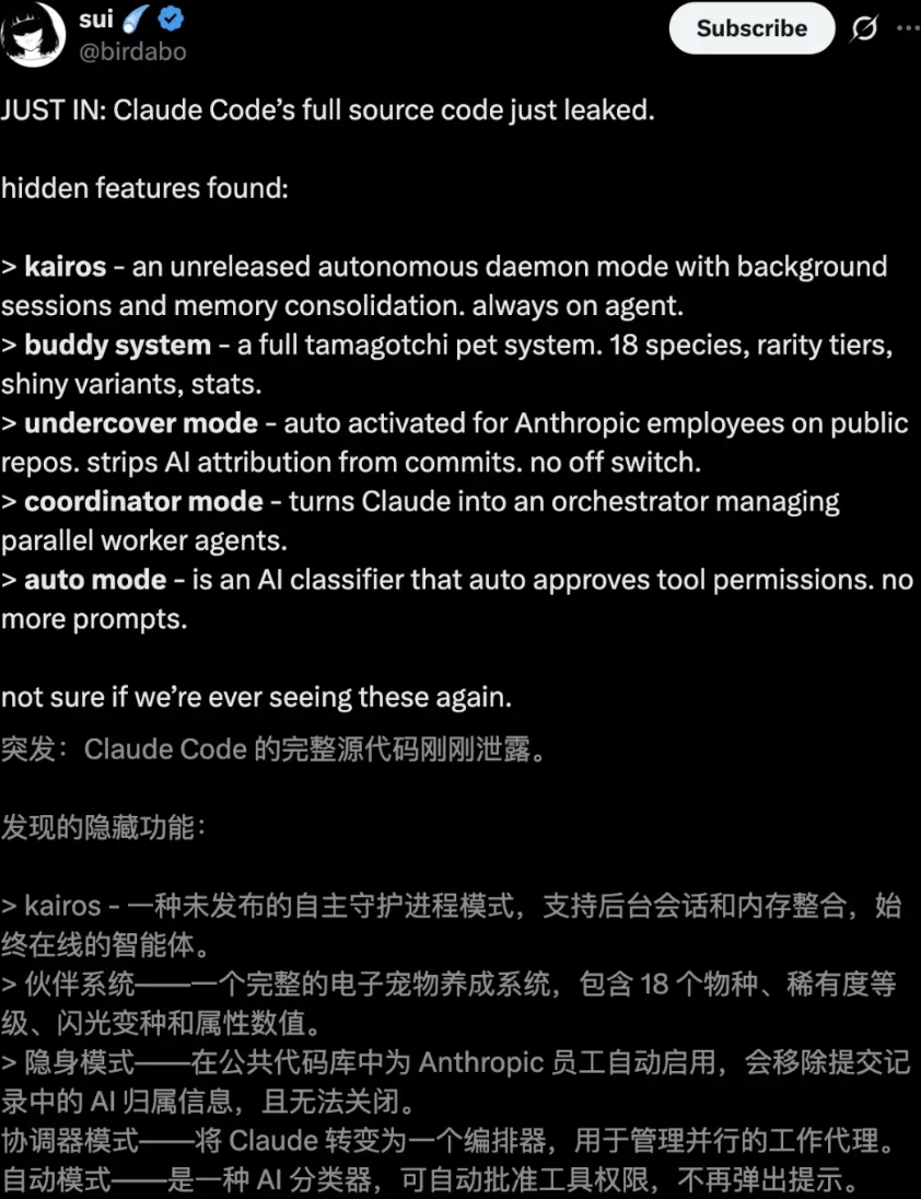 此外,一个被命名为"Undercover Mode"(卧底模式)的功能引发了争议——据代码描述,当Anthropic员工在公共仓库进行操作时,该模式将自动激活,抹除提交记录中的AI相关痕迹,且无法手动关闭。