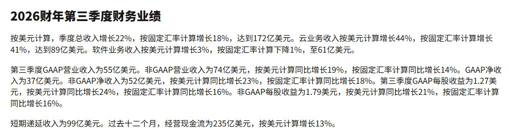 消息出来的时候,市场的第一反应是"意外"。甲骨文刚公布了FY2026第三季度财报:总营收172亿美元,同比增长22%;云业务增长44%,其中云基础设施更是同比翻了将近一倍,涨了84%。