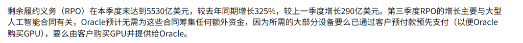 但这也恰好说明了另一件事。甲骨文现在的RPO(未来业绩义务)已经涨到5530亿美元,其中包括和OpenAI等公司签的大合同,同比增幅高达359%。