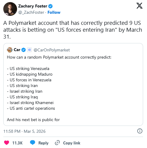 市场已开始对不断上升的地缘政治风险做出反应。一些成功预测伊朗战争爆发日期的Polymarket内部人士,现在正大力押注美国将向伊朗派遣地面部队。