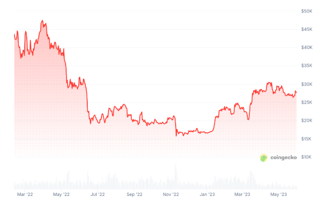 在俄乌战争爆发的第一年,比特币价格大幅下跌。来源:CoinGecko