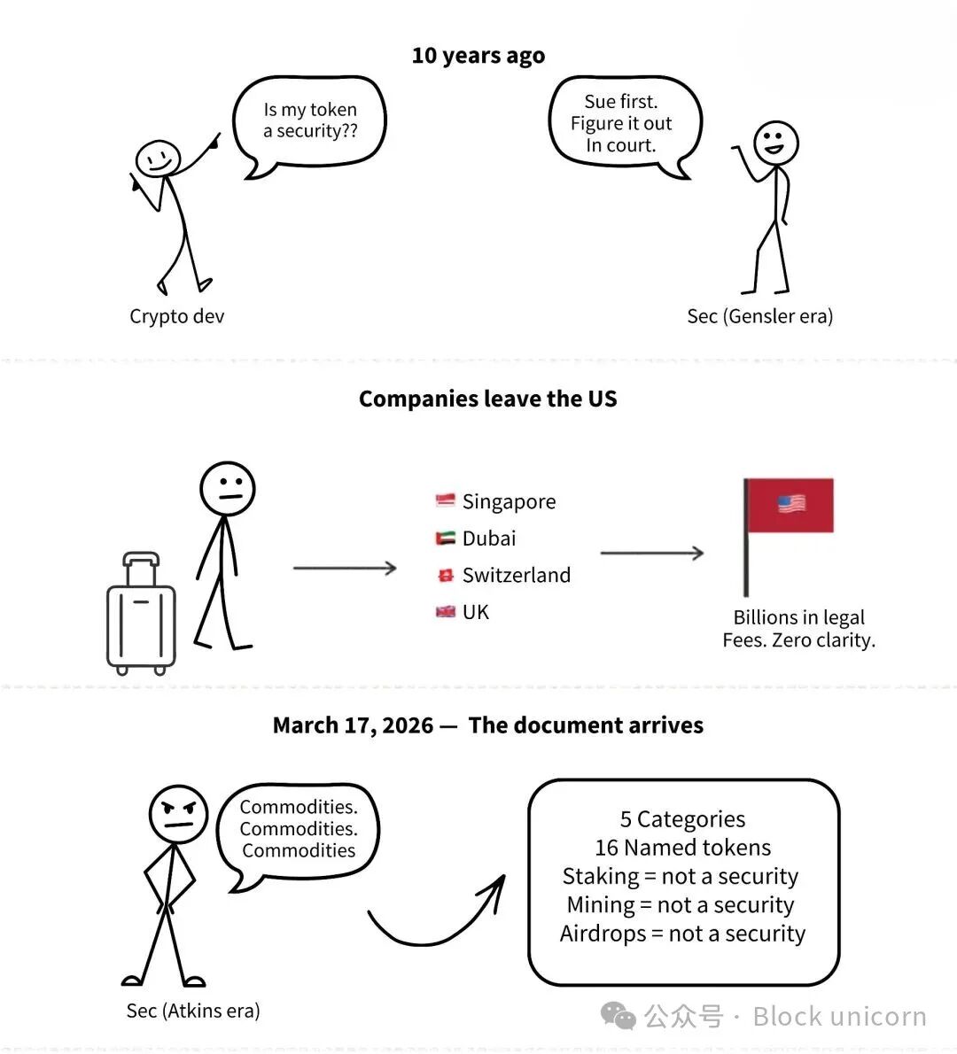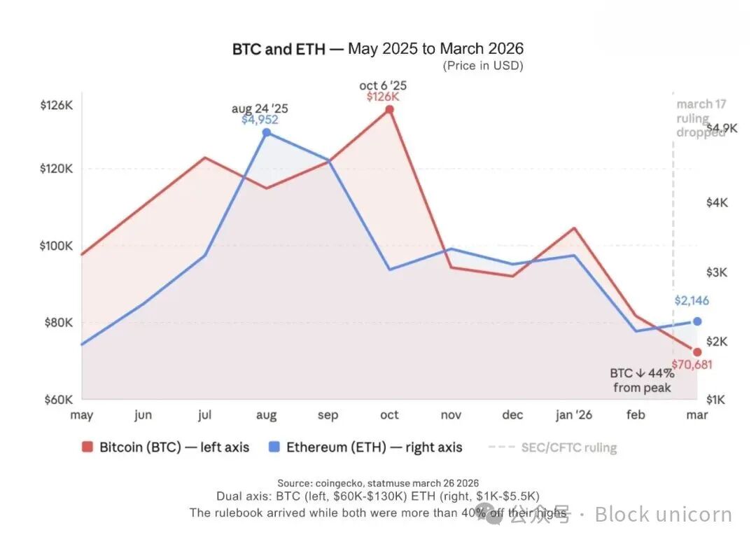而就在这时,3 月 17 日,美国证券交易委员会(SEC)和商品期货交易委员会(CFTC)发布了一份文件,最终揭晓了你所持有的代币究竟是什么。此前,双方经历了长达十年的诉讼、数百次执法行动以及数十亿美元的法律费用。一些公司甚至选择搬迁到新加坡,而不是继续与加里·根斯勒(Gary Gensler)玩猜谜游戏。而就在以太坊价格跌破 1900 美元的那一周,答案终于揭晓了。