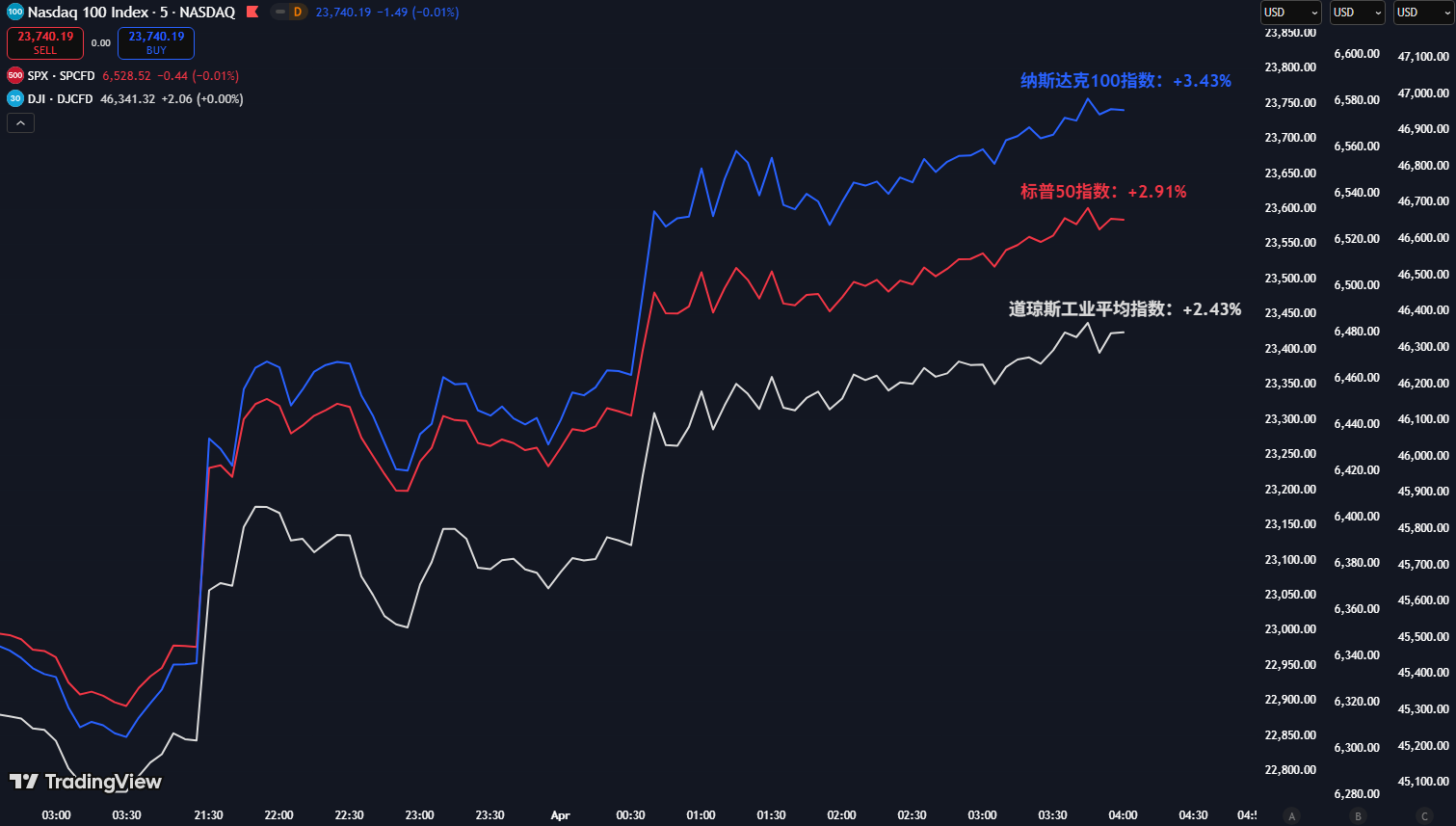 与此同时,标普500指数上涨2.91%,除能源板块外几乎是其余股票全线收涨,显示出风险偏好的逐渐回暖。此外,传统蓝筹股也同步受益,道琼斯工业平均指数同样表现不俗也上涨了2.49%。