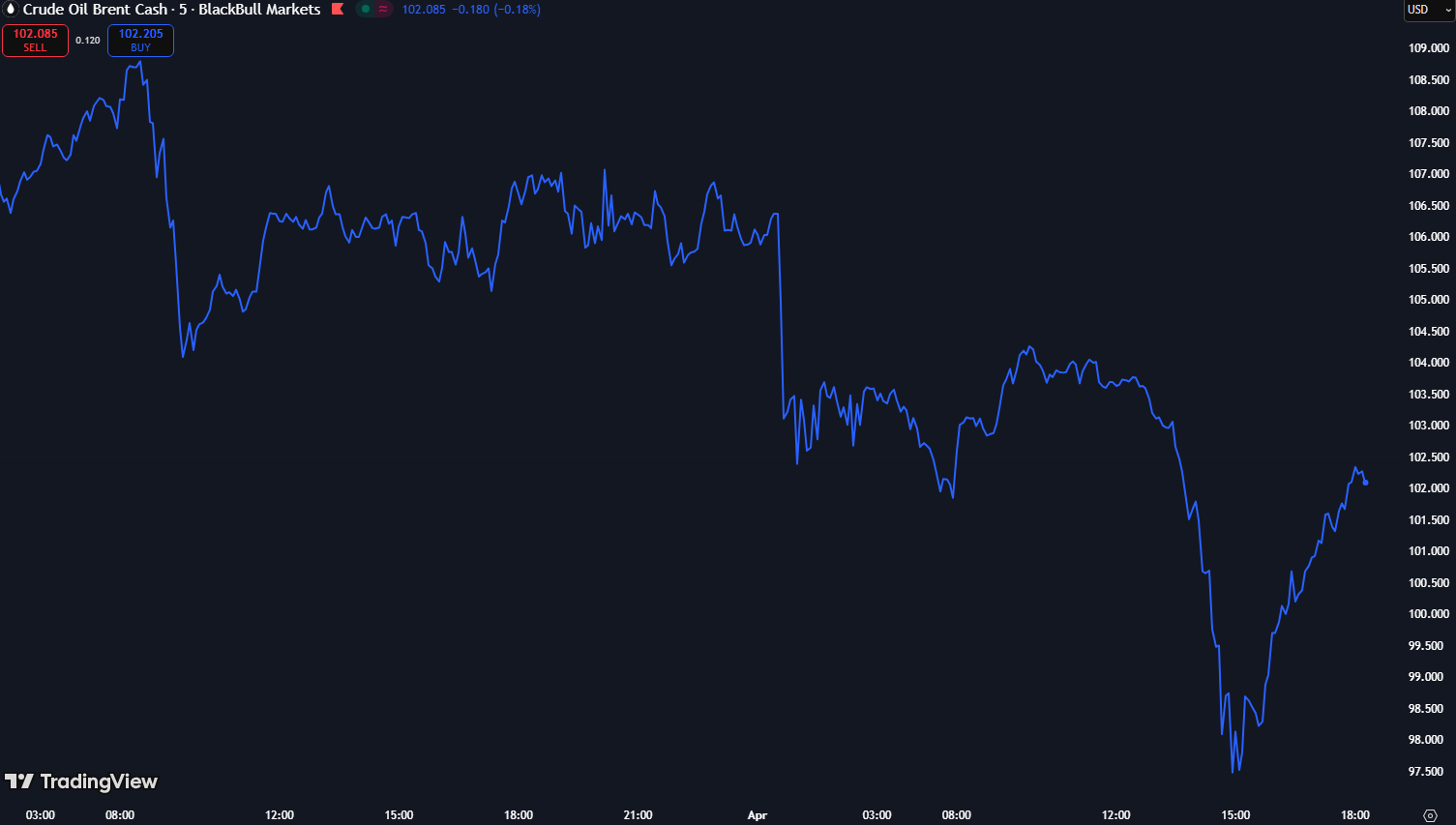 布伦特原油的价格从此前的110美元/桶的高点迅速回落,目前接近102美元/桶的价位。曾一度跌破了100美元的关键心理价位,最低触及97.5美元/桶。