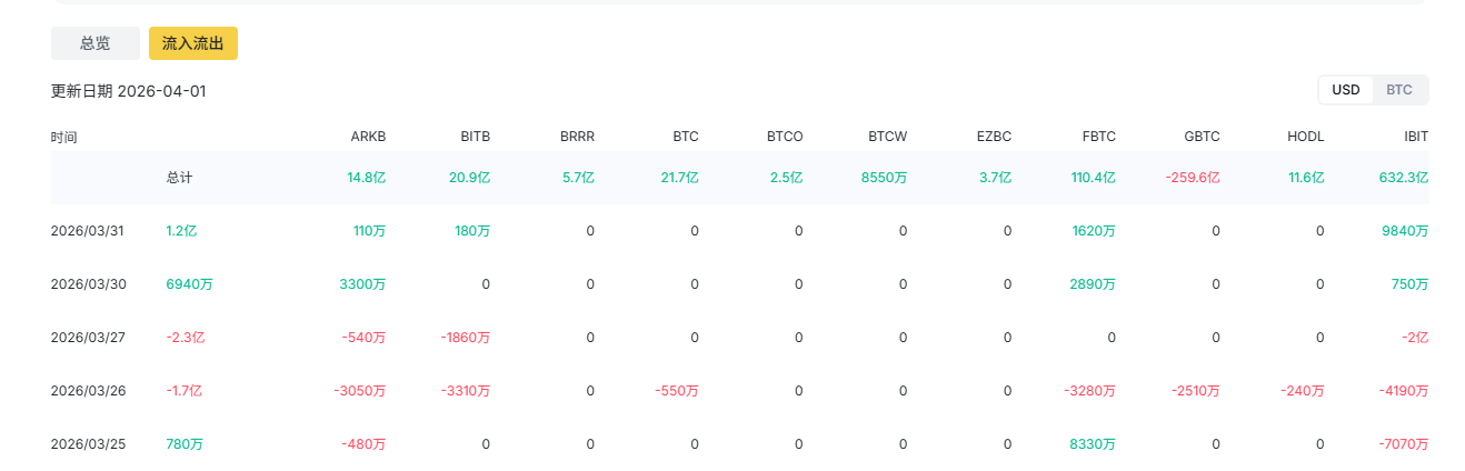 具体来看,在3月30日,华尔街比特币现货ETF的净流入资金规模合计6940万美元;而在3月31日,资金净流入规模更是明显的增加,超过了1亿美元,净流入资金总计1.2亿美元。
