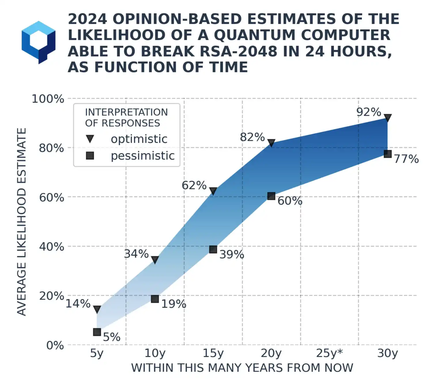 量子计算机能在 1 天内破解 RSA-2048 的预测图,图源: Global Risk Institute