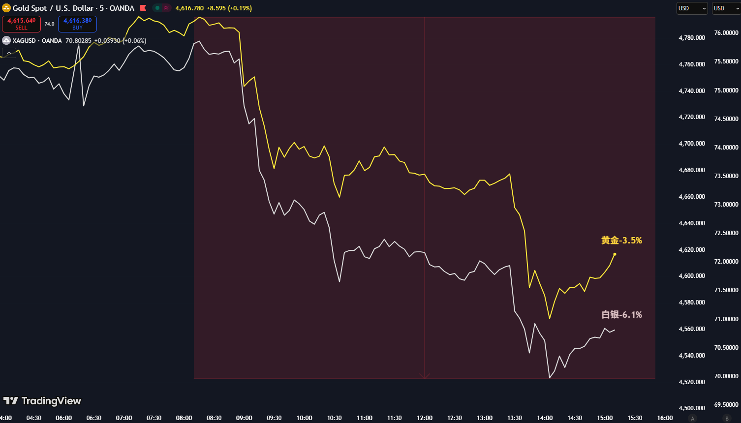 在特朗普今早发表讲话后,现货黄金从日内高点4799美元/盎司一路砸到4585美元/盎司,跌幅超过150美元/盎司。