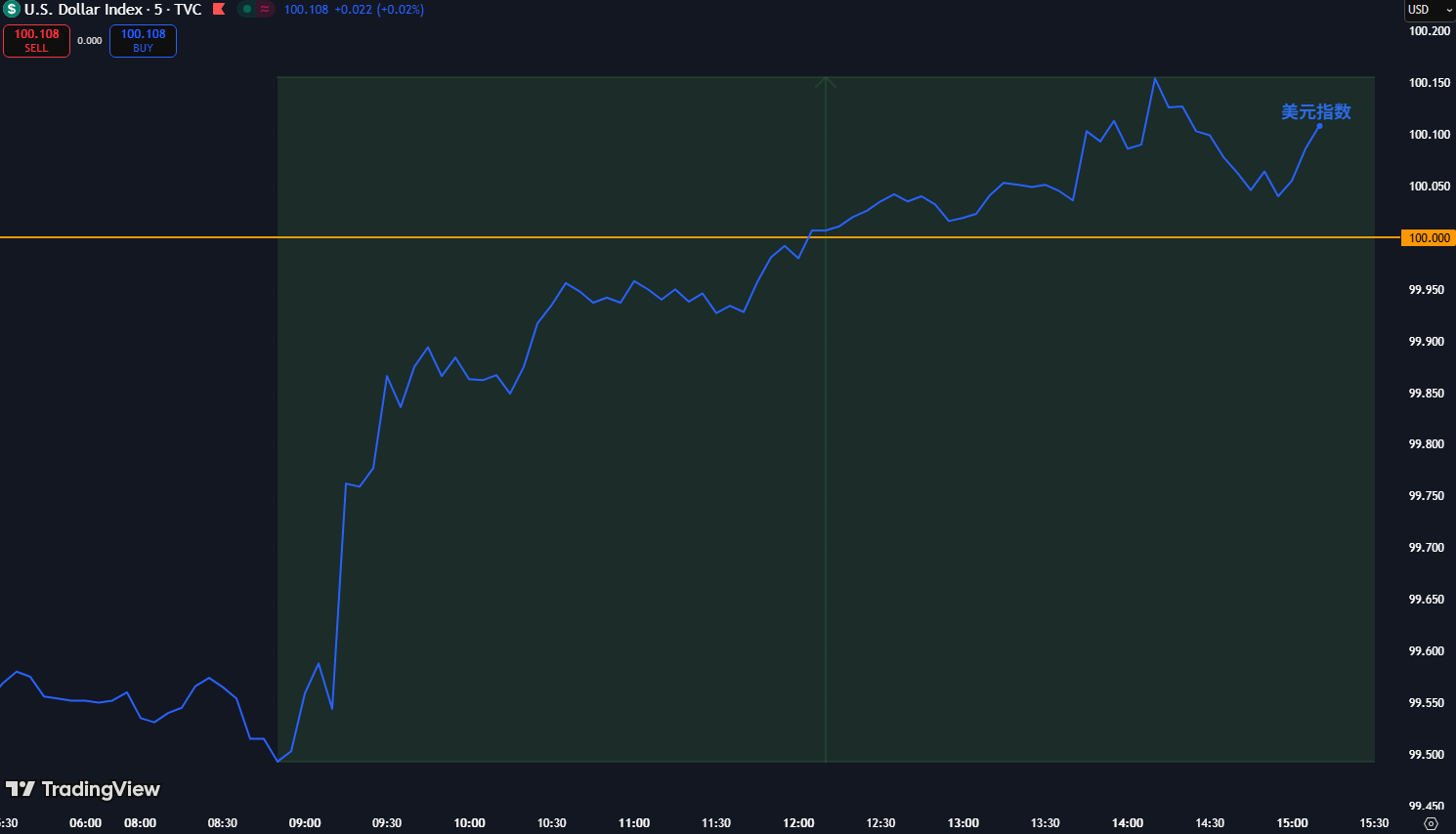 黄金白银银暴跌的另一个推手,是美元指数在反弹。美元指数DXY当天暴涨超0.5%,重新站上100整数关口!