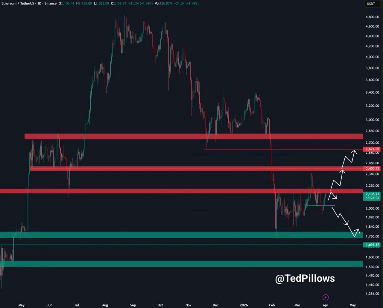 以太坊日线图上,ETH 价格已进入 2136 美元附近的关键阻力区域。市场分析师 Ted Pillows 表示,ETH 的下一步走势可能取决于它能否重新夺回 2150 美元至 2200 美元的区域。