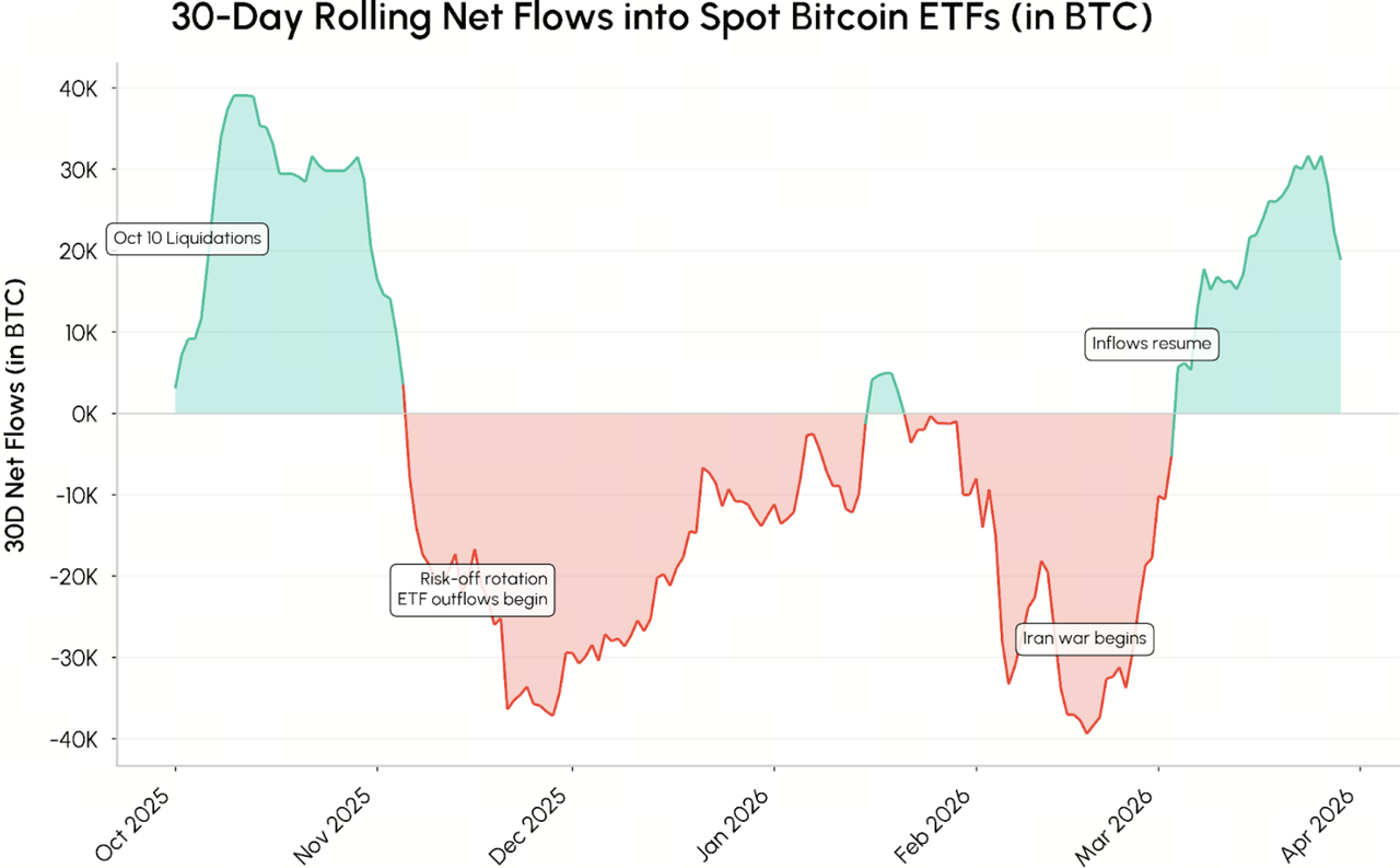一方面,本轮回撤的主要动力源于衍生品市场的高杠杆清算,而非基本面的瓦解。另一方面,即便在最动荡的 3 月,现货比特币 ETF 在经历了长达数月的净流出后,竟然在 30 天内录得 3 万枚 BTC 的逆势净流入。