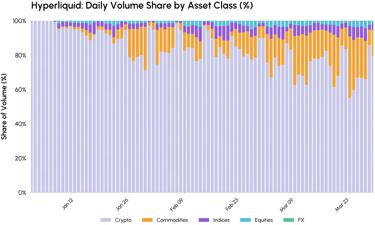 但在 2026 年 Q1,以 Hyperliquid 为代表的平台通过永续合约彻底抹平了这种割裂。数据指标显示,Hyperliquid 的非加密资产交易量占比已飙升至 45%。这意味着,全球交易员正在通过去中心化订单簿实时博弈原油、黄金与指数,而不再被动等待纽交所的钟声。