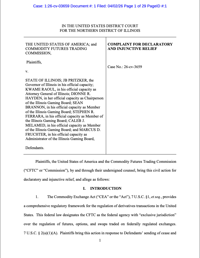 CFTC 针对伊利诺伊州公职人员和伊利诺伊州博彩委员会的诉讼。来源: Court Listener