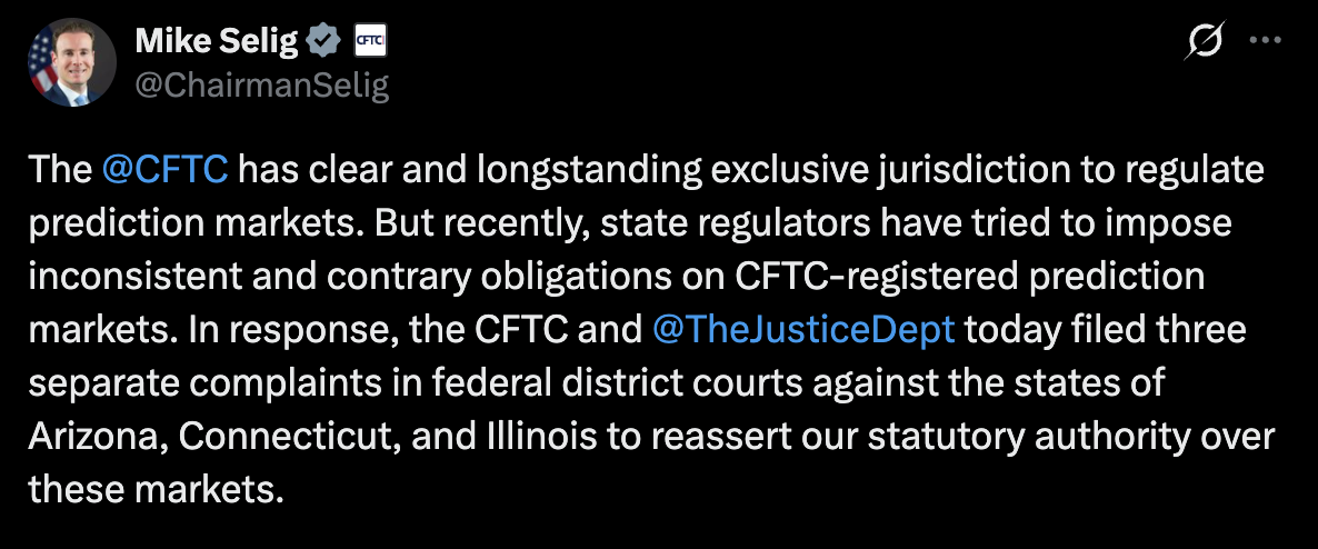 CFTC 主席 Mike Selig 在诉讼提起后表示:“这些州激进且过度的越权企图,已经导致市场不确定性,并对市场参与者和我们的注册机构带来可能 destabilizing 的影响。”