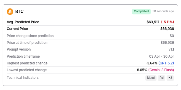为了看看事情会如何发展,芬博尔德利用了……人工智能驱动的价格预测工具评估比特币未来几周的前景。该模型汇总了来自以下机构的预测:ChatGPT使用 Gemini 3 Flash 和 Grok 4.1 生成一系列可能的结果。