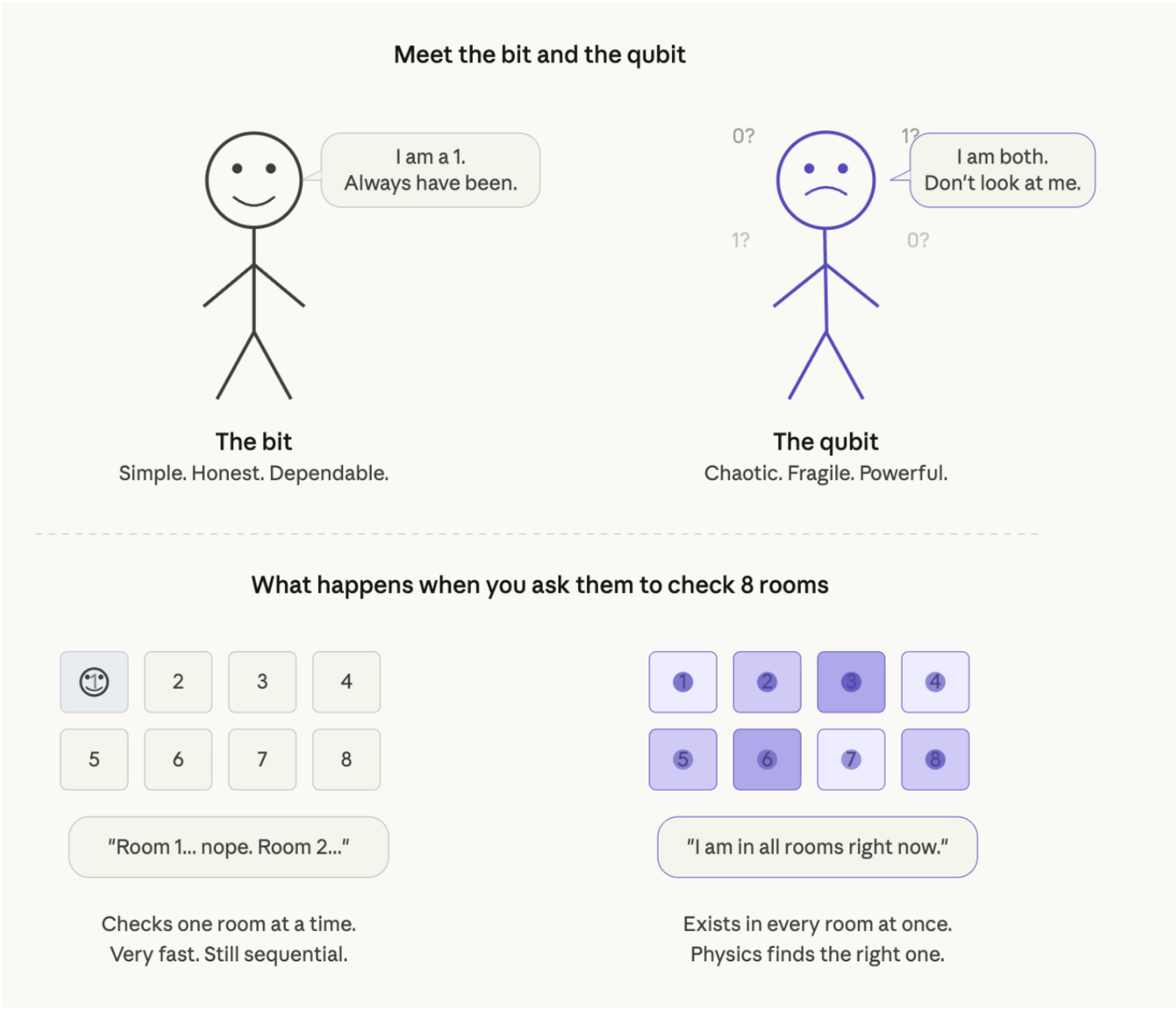 三个量子比特代表八种状态。十个量子比特代表1024种状态。五十个量子比特代表超过一千万亿种状态。每增加一个量子比特,数量就翻倍,这就是为什么扩展性呈指数级增长的原因。