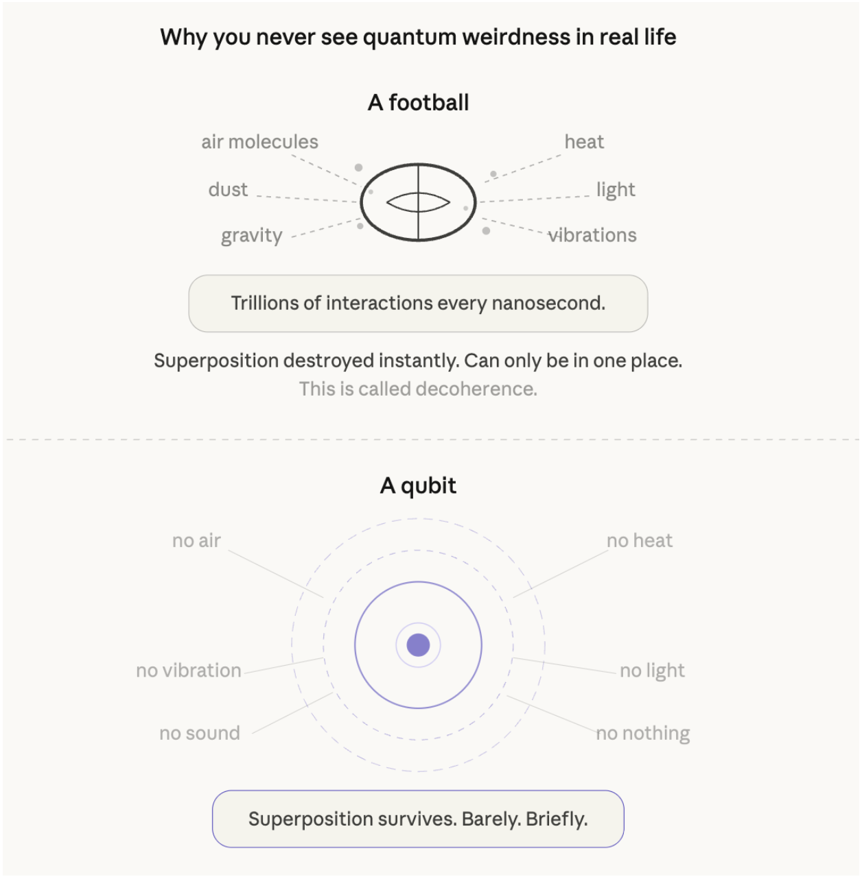足球不可能同时出现在两个地方,因为它每纳秒都在与数万亿个空气分子、灰尘、声音、热量、重力等等相互作用。但是,如果在接近绝对零度的真空中隔离出一个微弱的电流,并使其免受一切可能的干扰,那么这种量子行为就能持续足够长的时间,从而进行计算。
