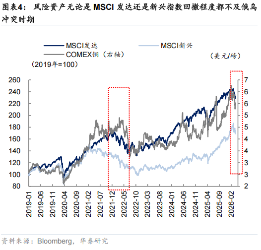 从周期性影响,也就是流动性冲击、通胀和增长这三个问题看,1)目前的流动性压力已经在逐步释放,如黄金市场中投机性净多头仓位相比2月高点已经下降10.0%。2)对通胀上升定价在油价100美元,如美债1年期盈亏平衡通胀率明显走高至5.2%;10年美债高点走至4.5%,都已超过我们此前在油价中枢100美元假设下的测算点位(《高油价下的“赢家和输家”》,2025.3.9)。3)部分但并未完全定价增长下行,具体体现为工业金属如铜价开始走弱但程度不深,铜与黄金比价反而从3月初至今提升超10%;10年-2年美债利差虽相比2月收窄10bp,但距离倒挂仍有50bp的距离;风险资产无论是MSCI发达还是新兴指数回撤程度都不及俄乌冲突时期,且下跌主要由估值贡献,盈利尚未持续性下修。
