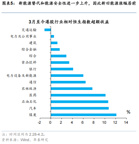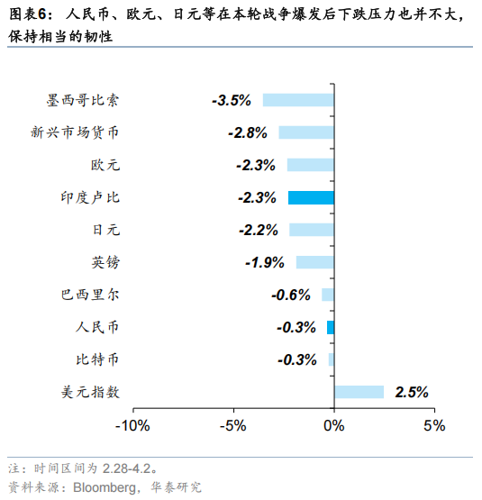 从长期结构性问题上,市场在同步定价当前冲击带来的长期格局变化。1)新能源替代和能源、粮食等安全性进一步上升,因此市场中新旧能源一起上涨。截止4月2日,煤炭、石油石化等传统能源板块,与汽车、电新这一新能源板块,在港股市场中均涨幅居前。2)去美元化会延续而不是逆转。因此虽然短期流动性压力导致美元指数冲高,但仅仅上升2.1%的程度并不大,尤其是相比历史上地缘冲突时的资金大规模流入美国避险的情形(如俄乌冲突爆发后3个月美元升值6.2%)。其他主要货币例如人民币、欧元等在本轮下跌压力也并不大,保持相当的韧性。