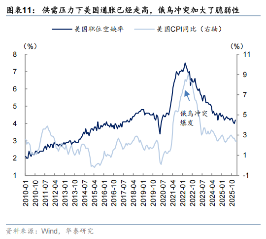 2)当前全球需求和增长水平却相对上述两个历史阶段偏弱。目前美国总体经济增长数据虽然仍有韧性,但是K型经济形态分化严重,从衡量经济压力的就业数据看,2月非农新增就业转负。全球其他主要经济体呈现的情况类似,在科技需求刺激的增长之外相对疲弱。但相比之下,在第一次石油危机后,宽松财政+实际利率为负的货币政策支持下美国的经济快速从衰退中修复并延续高增长直到1978年第二次石油危机之前。2022年俄乌冲突前更是如此,大规模的财政和货币宽松导致美国实际商品消费增速不降反升,失业率数据处在下降通道中。
