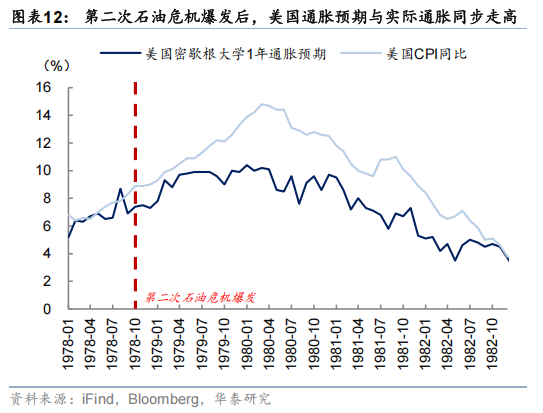 我们选取70年代后期石油危机和2022年俄乌冲突作为样本,去掉布雷顿森林体系解体影响较大的70年代初期。这两段经历有相似的背景环境:在能源供给侧冲击发生之前,宽松政策刺激下经济都从低谷(分别为第一次滞胀和疫情冲击)强劲修复,美国通胀已经处于上升通道且水平较高。