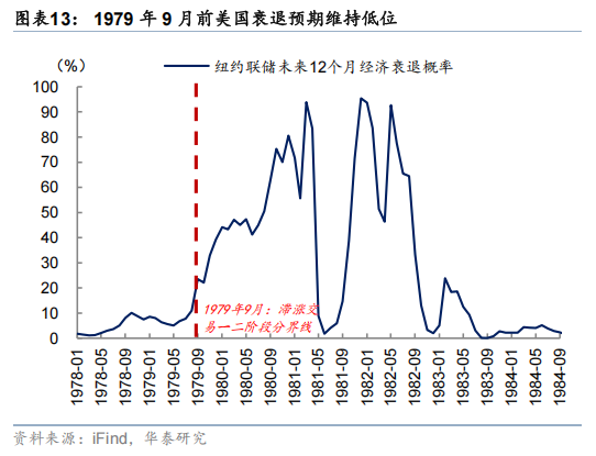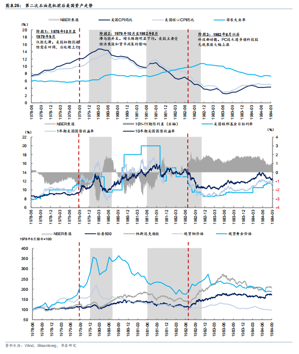 以1970年代中后期的滞胀交易为例,对通胀的交易发生在1978年10月至1979年9月。1978年10月伊朗反对沙阿政权的示威浪潮持续升温,11月石油工人集体罢工更使伊朗石油产量骤然锐减。由于此前美国通胀已经升温,且经历过70年代初的高通胀,市场担忧高通胀压力卷土重来,通胀预期快速走高。在这一背景下,标普500从1978年10月11日起持续回落,历时34个交易日,回撤幅度达12.24%。1978年11月,卡特政府联合主要盟国大规模干预外汇市场,并将贴现利率一次性上调100bps,政策精准击中市场核心担忧,悲观预期迅速逆转。尽管通胀预期与实际通胀仍持续上行,但1979年9月之前,美国衰退预期始终维持低位,铜价从1978年9月的1442美元/公吨持续攀升,至1979年9月已升至2096美元/公吨,涨幅达45%;黄金价格从217美元/盎司持续攀升至397美元/盎司,涨幅达47%;金铜比维持稳定,反映工业需求预期仍具韧性,市场对经济前景的信心并未动摇,企业盈利增长仍然强劲。这一阶段市场的主流叙事仍是"供给侧的暂时性扰动",而非系统性衰退的前兆,美股在"通胀抬头"与"增长免疫"的并存中延续上行趋势。
