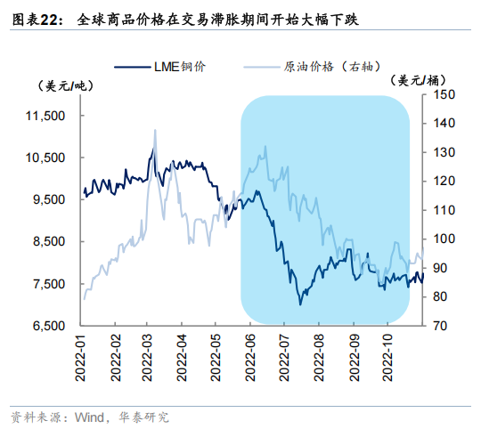 第二阶段的核心特征是“滞与胀并至”。供给冲击迟迟未能解决,通胀预期有失锚风险,面对积重难返的通胀局面,美联储不得不放弃此前的渐进立场,转而实施大幅且激进的加息。货币政策的急剧收紧叠加能源成本的持续侵蚀,美国经济增长预期开始实质性下修,市场从单纯的通胀交易切换为典型的滞胀交易,风险资产进入深度回撤。