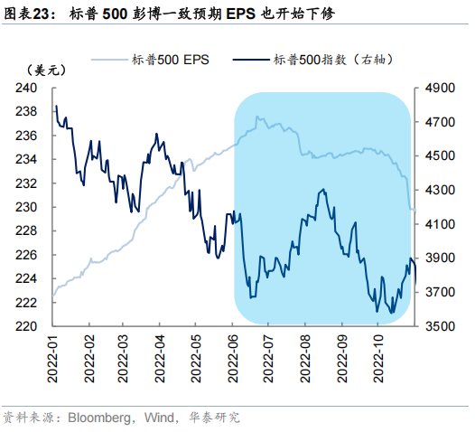 铜价走低、利率倒挂、股市盈利明确下修。LME铜价从6月初的约9700美元/吨暴跌至7月中的7000美元/吨,下跌近28%。铜价的崩盘标志着市场从“交易通胀”全面转向“交易衰退”。美国长短债利差在7月后持续深度倒挂,10月时已达到-0.37%,美国经济衰退预期成为市场共识。盈利预期在这一阶段开始出现明确的下修。标普500一致预期EPS在7月达到峰值后开始回落。疫情期间大幅扩张的科技企业纷纷启动裁员,Meta、Amazon、Twitter等公司相继宣布大规模裁员计划,美股也经历了深度回撤。标普500从8月中旬的4305点后再次掉头向下,最终在10月12日触及3577点的年内低点,较年初高点累计下跌25.4%。纳斯达克全年跌幅更是达到33%。