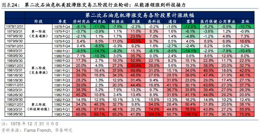 70年代后期和2022年的资产交易都呈现出三个阶段的特点:第一阶段的核心特征是“仅胀无滞”。供给冲击推高通胀,市场对经济增长略有担忧,但由于前期普遍处在高增速的环境,对增长韧性的判断尚有惯性。第二阶段的核心特征是“滞与胀并至”。供给冲击迟迟未能解决,通胀预期有失锚风险,货币政策的急剧收紧叠加能源成本的持续侵蚀,经济增长预期开始实质性下修,市场从单纯的通胀交易切换为典型的滞胀交易。第三阶段的核心特征是“旧逻辑出清,科技创新接棒”。供给与需求在低水平下形成新均衡。然而此时经济仍处于修复初期,周期性因子尚无力独立支撑市场走出低谷,科技创新提供超越周期的全新叙事,最终引领经济与股市走出滞胀阴霾。