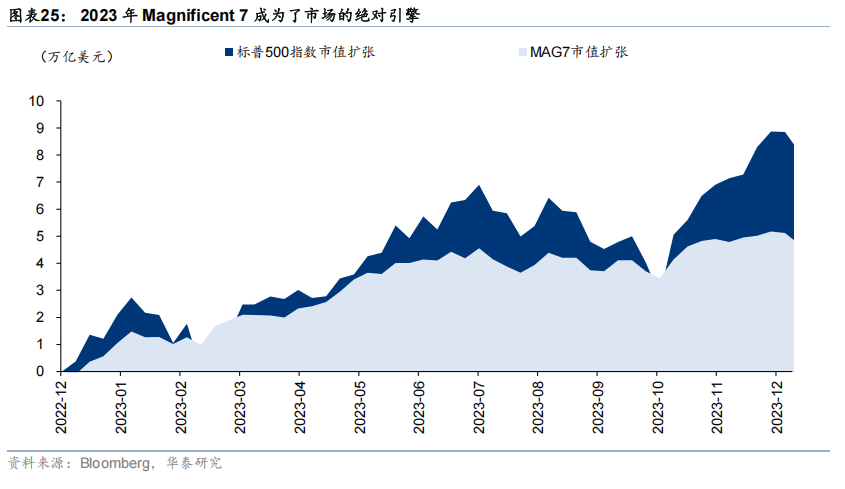 2022年底ChatGPT的出现驱动Mag7反弹,几乎贡献了2023年美股的所有涨幅。2022年11月30日,OpenAI发布ChatGPT,这是改变美国市场轨迹的“黑天鹅”事件。它打破了宏观对市场的影响,开启了由科技创新动能主导的新逻辑。市场不再纠结于当下的高利率,而是上修远期盈利预期。AI被视为继互联网后的又一次生产力革命,赋予了美股科技巨头极高的成长溢价。Magnificent 7(苹果、微软、英伟达、特斯拉等)成为了市场的绝对引擎。数据显示,自ChatGPT发布至2023年底,标普500约62%的涨幅由AI相关巨头贡献;2023年全年,这七家公司市值增加超5万亿美元,几乎以一己之力抵消了2022年的熊市跌幅。从长久期的角度来看,无论是上世纪70年代末的PC,抑或是2022年底的GPT革命,科技创新动能出现终究把市场拉出增长的泥潭。