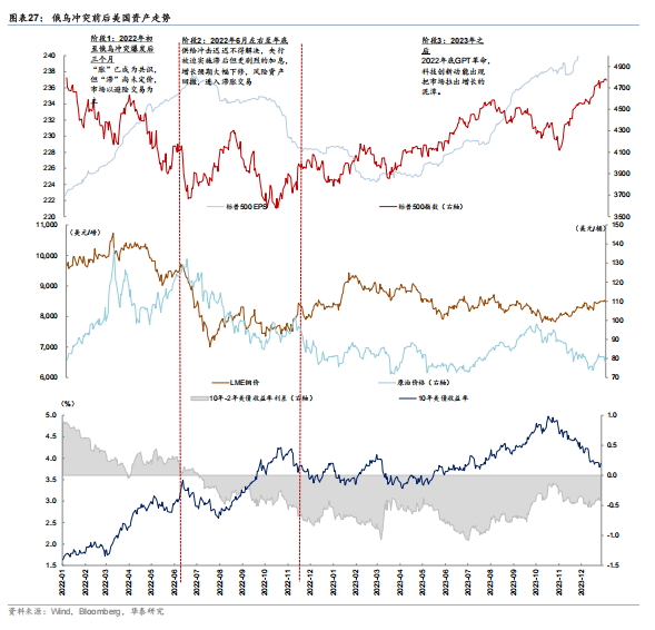 在能源冲击发生后,第一阶段首先交易通胀,铜油等资源品上涨、通胀预期走高推动利率上升、股市因避险等下跌但程度不深,期间也常有反弹;第二阶段过渡到衰退交易,当通胀未能如预期般成为暂时性冲击,增长预期开始实质性下修,紧缩政策加大衰退压力,中长期利率停止上行甚至转为下降,股票深度回撤,铜等工业金属转为下跌;第三阶段新逻辑接棒,供需在低水平下均衡,周期性因子复苏靠后,但科技创新提供超越周期的增长(70年代末期的PC革命和2022年底的ChatGPT),引领股市走出滞胀阴霾。
