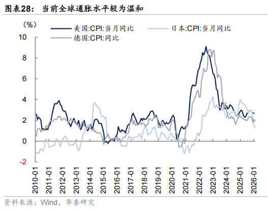 1)当前全球总体通胀水平低于70年代第二次石油危机和2022年俄乌冲突前的起点。2026年2月,美国、日本、德国CPI同比增速分别为2.4/1.3/1.9%。相比之下1978年10月石油危机前上述三国通胀水平8.9/3.7/2.4%,且由于刚经历过第一次石油危机的阴影,通胀预期也处在高位;2022年1月俄乌冲突前,美国、日本、德国CPI同比增速同样高达7.5/0.5/4.2%。