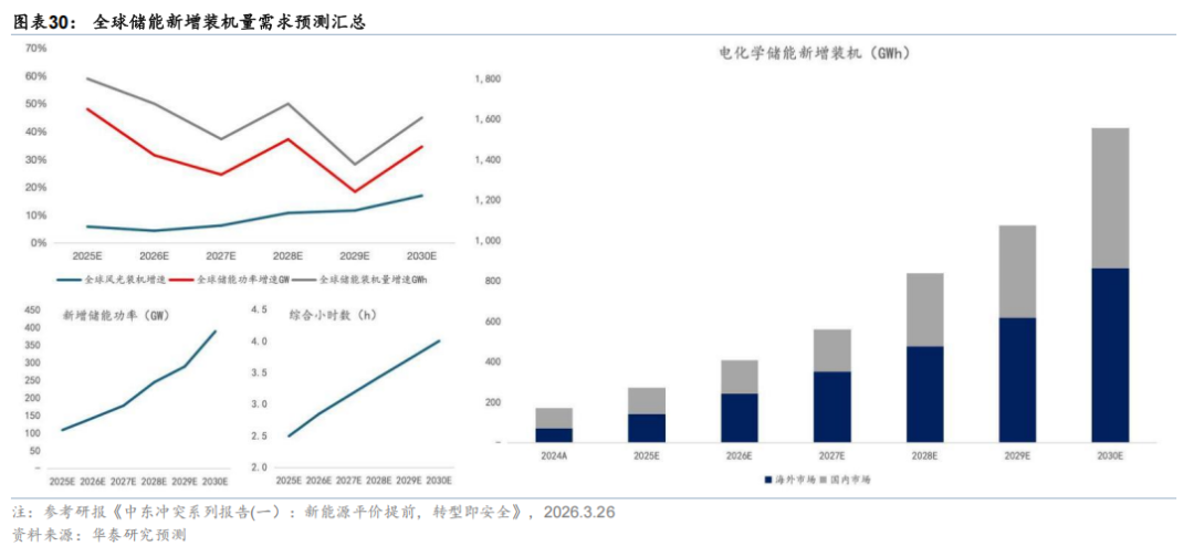 参考华泰电新团队测算(中东冲突系列报告(一):新能源平价提前,转型即安全,2026.3.26),锂电产业同时受海外乘用车电动化、国内商用车电动化、储能需求增长三重因素驱动,带动板块共振向上。1)海外乘用车:高油价强化电动车经济性,渗透率加速提升。2026年越南、印尼、印度、马来西亚电动化率提升至40%、20%、10%、10%,同比增加8、6、7、6个百分点,对应电池需求同比增长22.8GWh。2)国内商用车:电动化触及平价拐点,打开应用场景电动化替代增量空间。在短途高频运输(短倒运输、工程用车等)场景中,油价上行正加速电动重卡与柴油车实现经济性平价,预计2026年国内商用车将新增99.7GWh动力电池需求。3)储能:电池需求第二曲线逐步显现。在全球能源价格波动加剧、天然气推升电价中枢背景下,储能经济性有望改善,进一步放大锂电板块整体景气度。