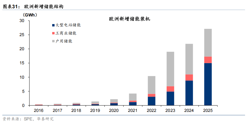 从板块受益顺序看,本轮能源价格上涨对新能源产业链需求催化的传导路径或为储能>光伏>风电,分布式>集中式,户用、工商业储能具备更强的弹性。一方面,油气价格向电价传导,电价抬升将直接提升分布式光伏+储能系统的投资回报率、缩短回本周期;另一方面,传统能源成本上升也在加速新能源与储能系统(大储)相对传统能源的平价进程,推动终端需求释放。历史经验已验证这一逻辑。在俄乌冲突期间,欧洲天然气与电价大幅上涨,居民侧电价显著抬升,户用光储成为降低用电成本的重要手段。2023年欧洲新增户用光伏装机约17.6GW、户用储能约12.2GWh,分别同比增长约38%和94%,欧洲市场户储厂商艾罗能源、固德威也均在2022年实现了储能逆变器出货的大幅增长。
