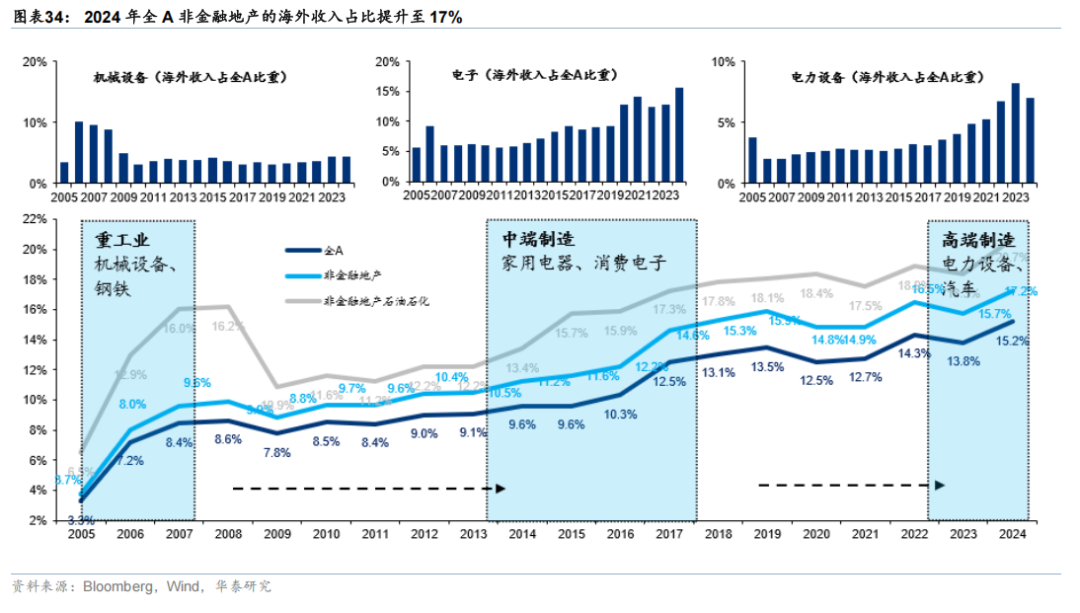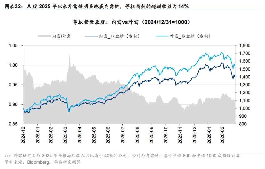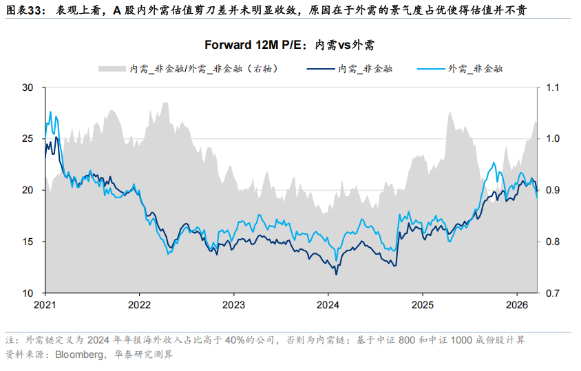 从估值上看,虽然过去外需链持续上涨,但相对内需链并不算贵,根本原因在于景气度占优。表观上看,外需链相对内需链并不贵,尤其是在经历了去年10月以来的相对估值修复后,当前A股内外需链的Forward P/E接近平价。但是需要注意的是,这种性价比建立在中国资产海外收入占比提升、外需链相对内需链盈利优势扩张的趋势能够延续的前提下。