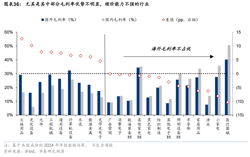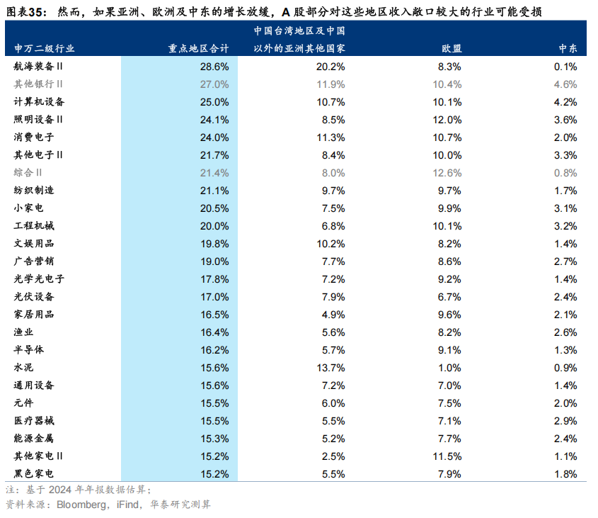 消费电子、纺织品、家电等可选消费品受到的负面冲击可能更大。我们认为,满足以下三个条件的行业受到负面冲击的风险相对大。第一,在重点地区(亚洲除中国、欧盟及中东)的收入敞口大(2024年年报>15%);第二,可选属性强,原材料成本敏感度高;第三,海外毛利率没有优势,换而言之,在海外的顺价能力并不强。上述筛选对应更可能承压的行业包括消费电子、家电(黑电、小家电)、纺织制造以及家居用品。
