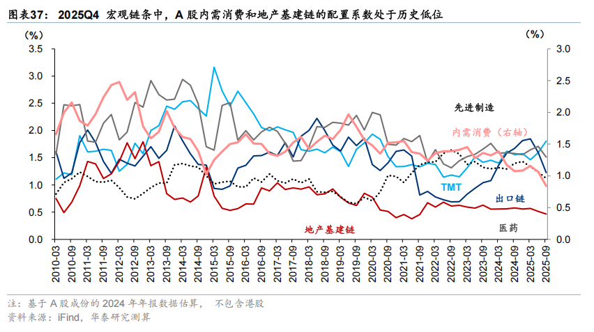 内需链筹码集中度低。从4Q25的公募配置系数看,A股TMT配置系数分位数位于70%以上的相对高位,先进制造配置系数分位数位于中枢位置,内需消费、医药、地产基建链产业链配置系数分位数均位于10%以下的低位,其中内需消费配置系数分位数仅为0%,筹码出清程度较高。