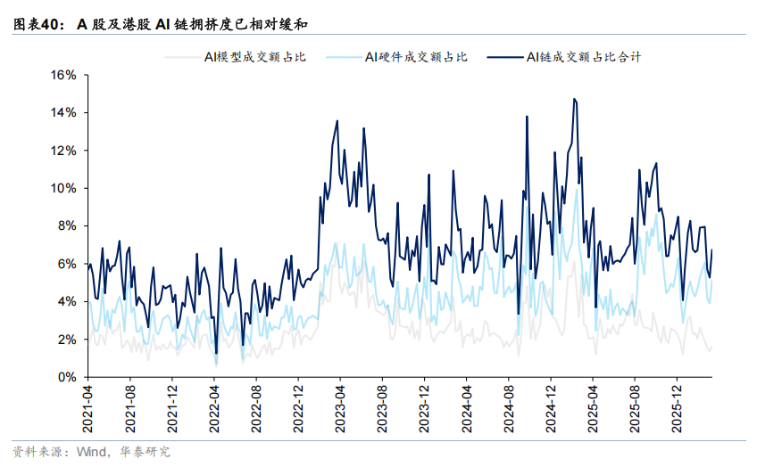 AI板块近期分歧加大,波动幅度放大。从短期视角看,由于AI尤其是硬件拥挤度偏高,且全球AI上涨趋势“火车头”美股相关公司稳定性下降,再加之流动性压力、电力价格上升和部分生产环节可能受阻等负面影响,短期或受一定冲击。但从产业侧看,AI进展依然延续,且应用普及率不断上升,产业发展本身并未中断。在当前交易定价至第二阶段时,AI链有望再度跑赢。
