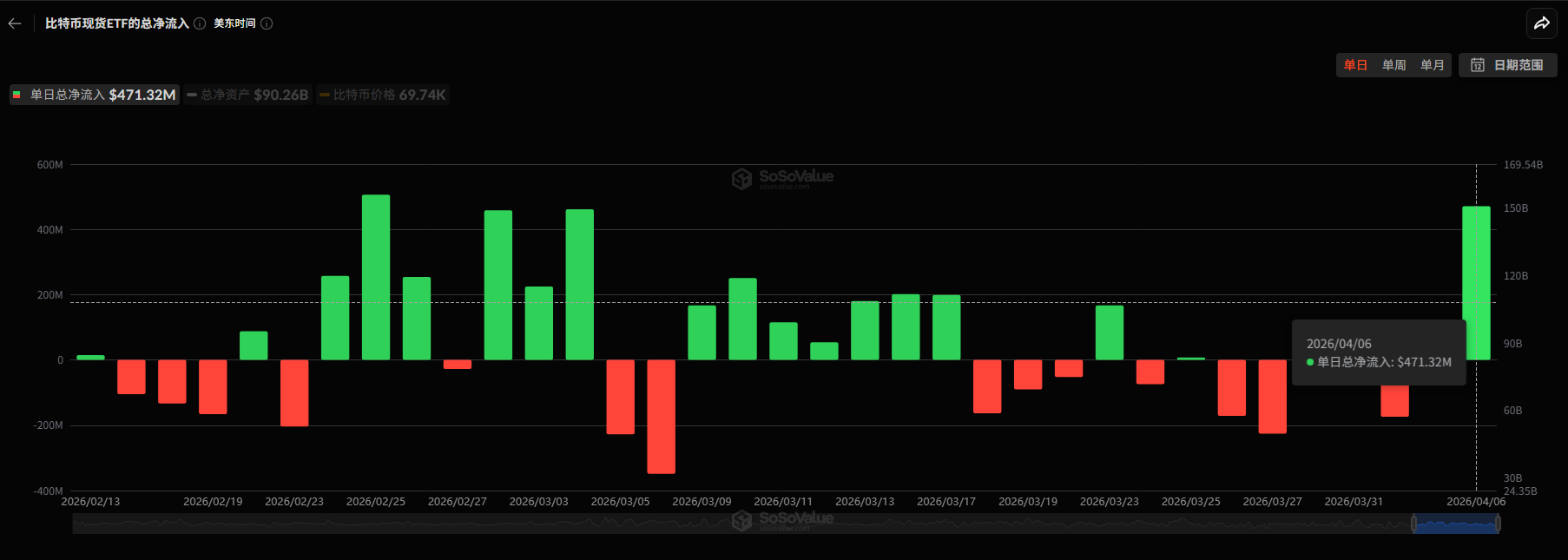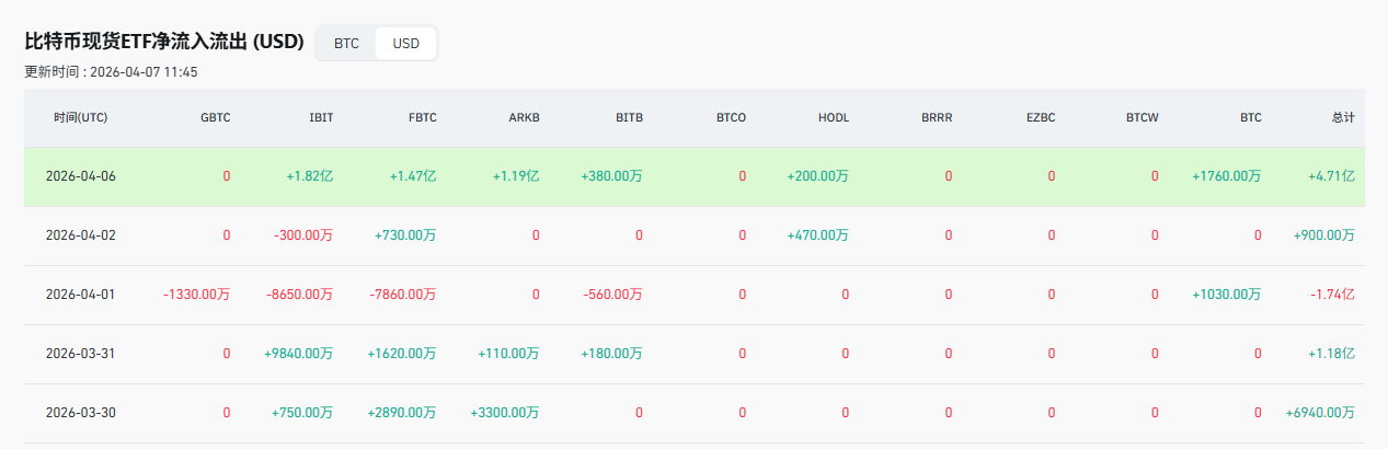 单日净流入4.71亿美元!这是华尔街比特币现货ETF在4月6日交出的单日净流入成绩单,也是自2月25日以来最强的一次单日资金净买入。单看这个数字,不算夸张;放回这几个月比特币的走势里看,情况就不一样了。