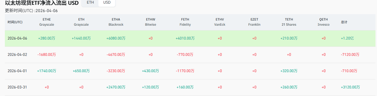 4月6日,美国以太坊现货ETF单日净流入约1.20亿美元,结束此前连续两日净流出。这个数字不一定意味着现货ETH马上要起行情,但至少说明机构没有把“减仓加密资产”当成唯一选项。