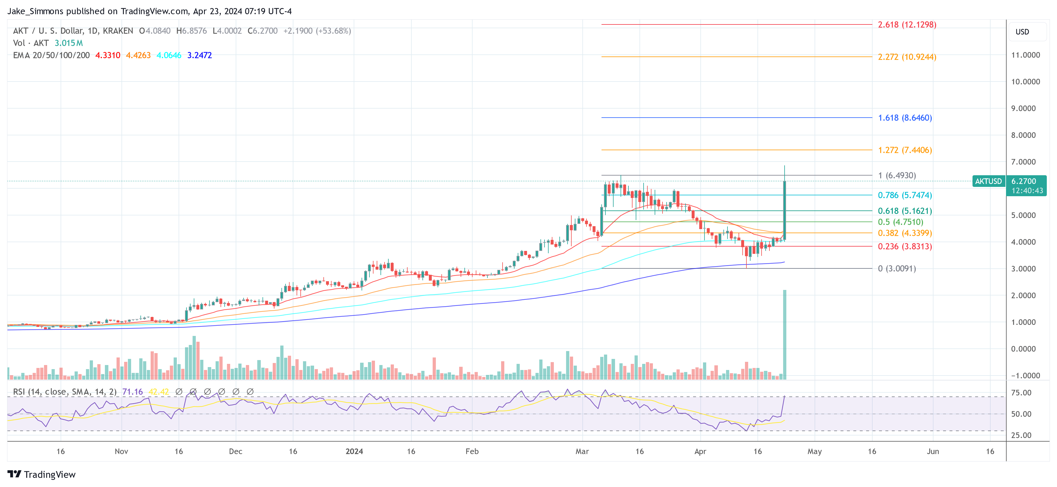 As of this writing, AKT is trading at $6.03. This increase in price has pushed its market cap to approximately $1.4 billion, positioning it as the 68th-largest cryptocurrency. Additionally, Akash Network’s trading volume has seen a dramatic rise of 2,790%, reaching $116 million today.