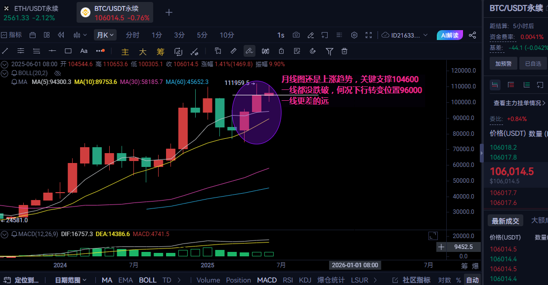 操作建议:大饼先现价105800附近看空,目标看到104600-105100附近多单,目标107300附近。