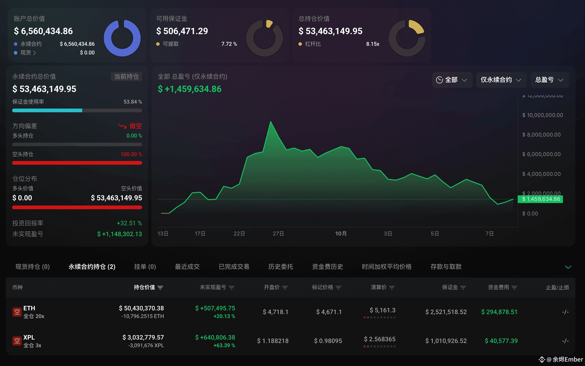 💎钻石手的定力值多少钱?至少对这位老哥来说,值 $1000 万: ◎9/13,$4,718 开空 10,796 枚 ETH,随后 ETH 持续下跌; ◎9/25 ETH 跌到 $3,815,这个空单当时浮盈 $975 万; ◎现在,ETH 又重新涨回到他的开仓价附近了,浮盈也基本全部回吐。 从开仓到浮盈接近 $1000 万,又重新回到原点。老哥既没减仓也没平仓,就是拿着。