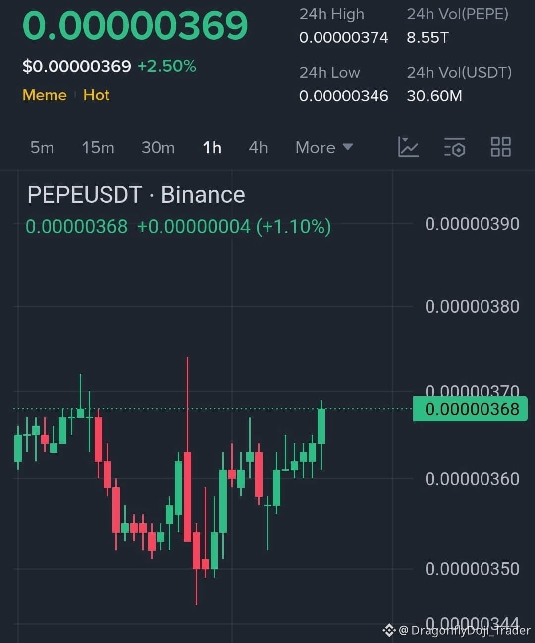 #PEPE is trading at $0.00000369 (+2.50%), showing signs of recovery after rebounding from recent lows. The price is holding above short-term support – buyers are attempting to extend the rally.