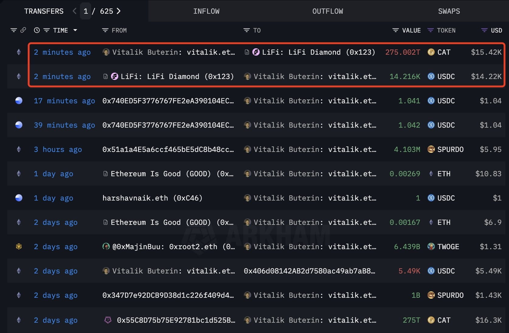 According to Lookonchain data, Vitalik Buterin has once again dumped a batch of free Meme tokens, exchanging them for 14,216 USDC.